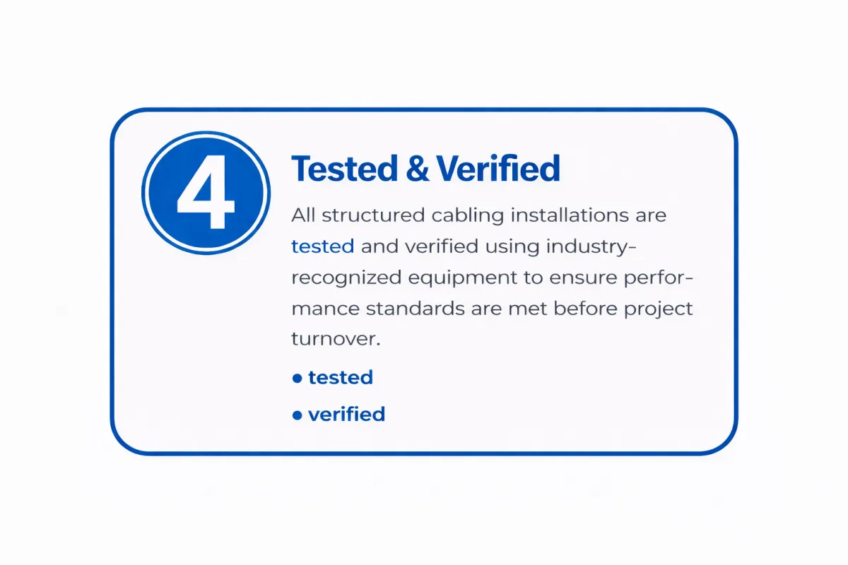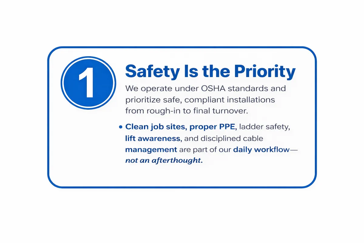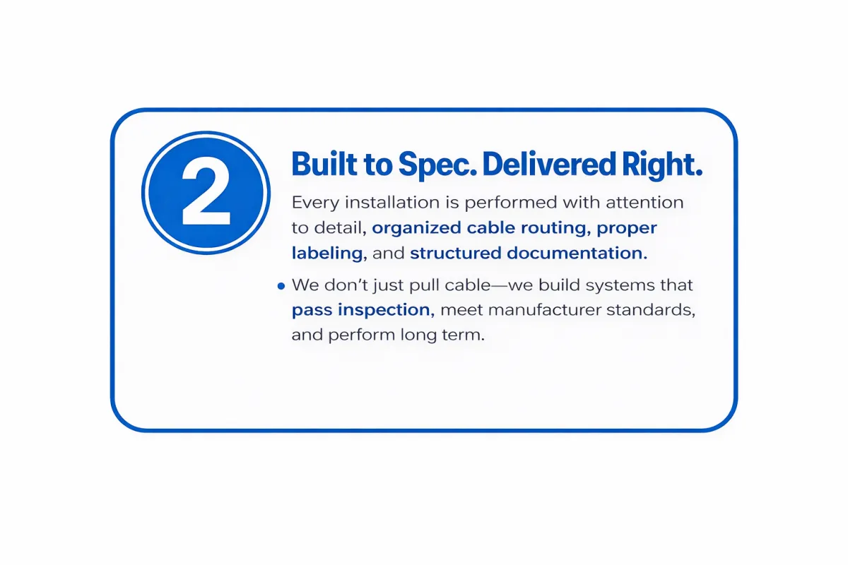 We provide structured cabling and network infrastructure installations for commercial construction and retrofit projects, with limited residential support. From pathway coordination to final rack build-outs and certification, our systems are installed to meet commercial standards and demanding project timelines.