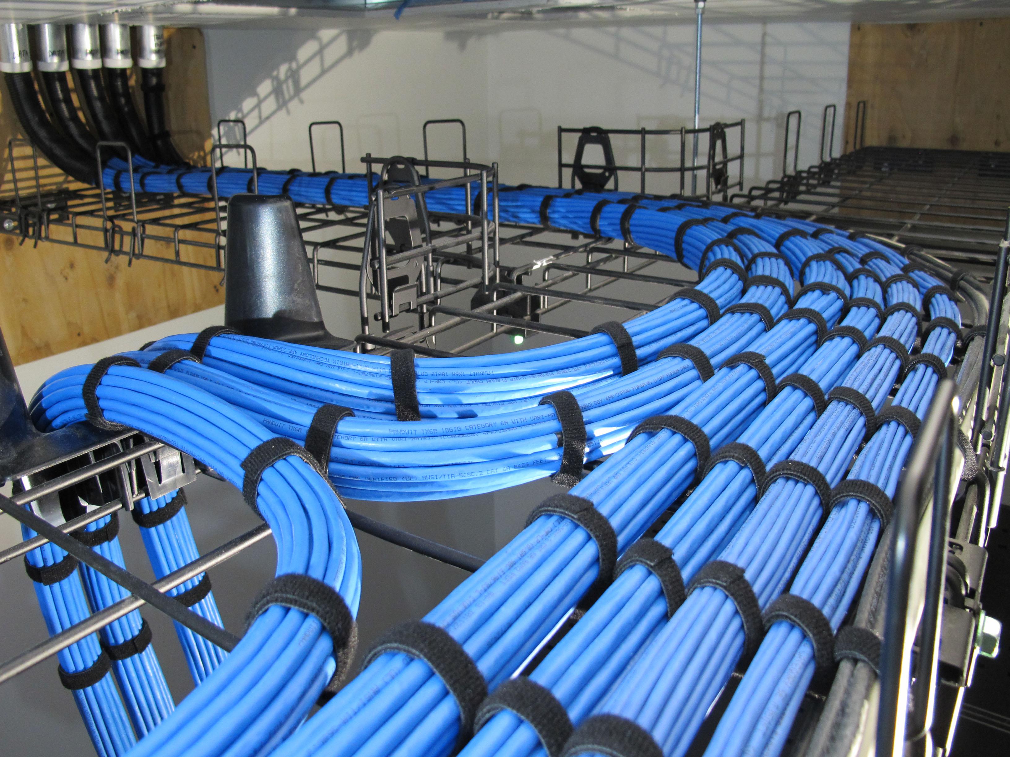 Installation of Cat6, Cat6A, and fiber cabling systems for commercial environments. Includes pathway coordination, cable routing, termination, labeling, and organized system layout.